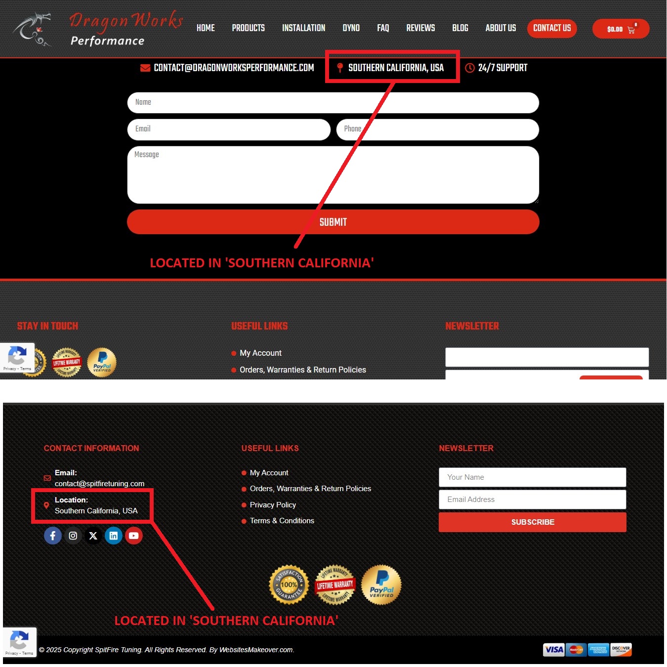 The top two are the ‘Spitfire Tuning Performance Chip’ and the ‘Dragonworks Performance Chip’. Doing a web search of these two ‘chips’ points us to two websites which sell them: spitfiretuning.com and dragonworksperformance.com. Both sites look very similar in layout and both claim to be located in southern California, USA: