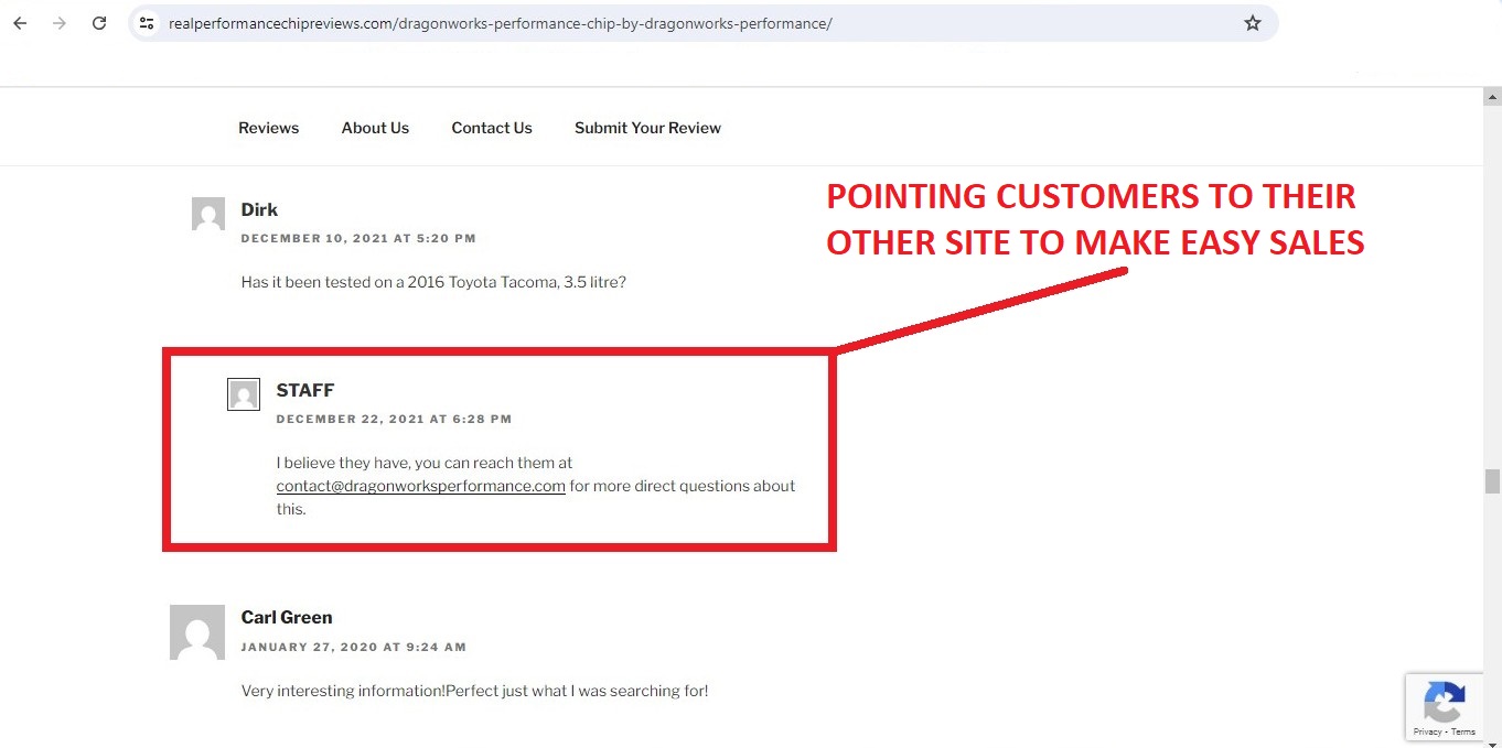 It looks like we found our answer. The name of the user who runs the review site is “mungerjeff07”. He obviously didn’t know this would be visible and assumed it was hidden. OOPS! The website rates the Spitfire chip and Dragonworks chip well because it is run by the SAME individual who applied for trademarks for BOTH products! Now it all makes sense. While it may not be illegal (yet) to fabricate a fake review site to push your own products, it IS extremely immoral. Let’s look deeper at the now-confirmed fake review site at realperformancechipreviews.com and see what else we can determine:
