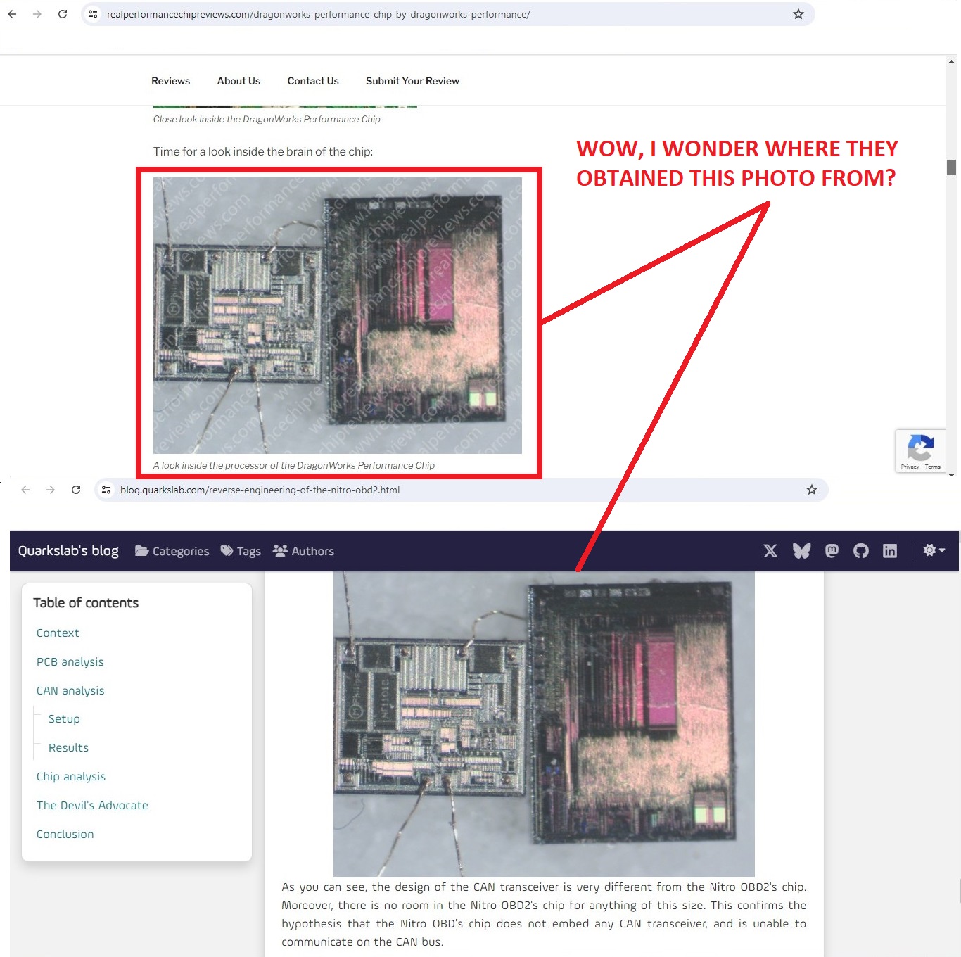 Here they claim the photo is the inside of the Dragonworks chip. They are sort-of telling a fib and not at the same time. The lie is, they did not analyze anything – in reality it is a stolen photo from the genuine website at quarkslab. The truth is it really is from a scam chip, the Nitro OBD2! They hope to use the technical looking photo in an attempt to fool the user into believing they removed the top of the integrated circuit and proved the chip is legitimate. More bunk.