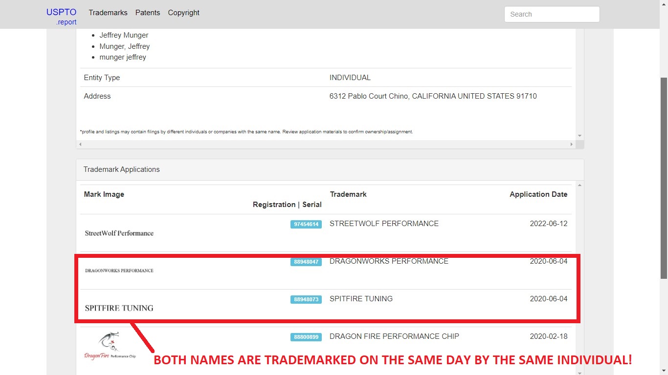 Now we see the plot thickens. Both trademarks “Dragonworks Performance” and “Spitfire Tuning” were applied for on the same day and by the same individual! They also trademarked two other names to be on the lookout for: “Dragonfire Performance Chip” and “Streetwolf Performance”. Chino, CA is indeed in southern California and it appears this is the source of these chips, which we have already determined to be a scam in previous reviews. Now that we know these fake modules are both sold by the same scammers, can we prove the review site is related, or are they just mistaken in their findings?
